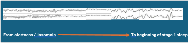 People with insomnia get ‘trapped’ in the first 3-4 patterns. Heathy efficient sleepers take approximately 12 -25 minutes to progress through to stage one sleep where sleep spindels appear.